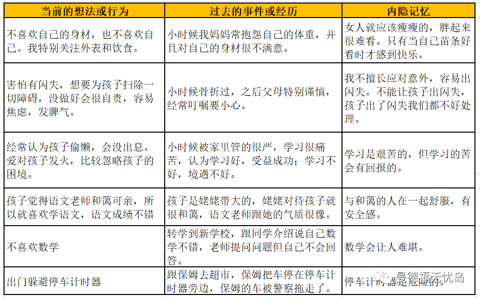 在一开始的时候,我们讲了一位咨询师妈妈很好地处理了孩子在车祸过程中的恐惧和担心故事。但我们生活中发生的事情太多了,不可能每一件事都可以像这位妈妈一样处理地那么完美。因此,我们也不必苛责自己去做完美父母。不过,我们可以在需要的时候,帮助孩子去探索内隐记忆。我们需要花一些时间和精力,帮孩子了解从过去的经历中都吸收了哪些东西,帮他们厘清思路、感受和情绪。