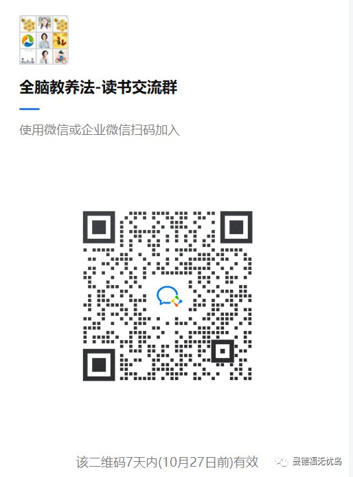 10月25日(周二)晚上七点半,在“曼德福无忧岛”视频号,郭毅老师将带领我们进行第4次读书分享会,下次学习第5章的内容,让孩子更具有专注力——整合自我。加入读书会交流分享群(见下方二维码),群内有**时间的直播通知,并在直播过程中,有小助手对直播内容的的精辟总结,还可以交流育儿经验,学习养育方法。