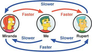 我们来看看。如果我告诉你我能跑得比我父亲快,米兰达也能跑得比我快,你会自动看出米兰达比我父亲快,我父亲比米兰达慢。