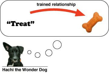 例如,假设我说了“treat”这个词,然后给我的狗八公一块饼干。作为一只聪明的狗,她很快就学会了声音“treat”等同于物体。每当她听到“treat”的声音,她就会想起真正的东西所带来的气味、味道和满足感。当有人说了那句话后,我们家周围就充满了兴奋。