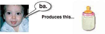 对沟通的简单解释。在这里,我们看到一个小孩学习通过声音来影响环境。婴儿通过发出各种各样的随机声音开始学习说话。当她发出一种对成年人有意义的声音时,事情就开始在环境中发生。在这里,“ba”之后就会出现一瓶美味的食物。瞧!给这个食谱增加复杂性,你就有了语言。