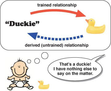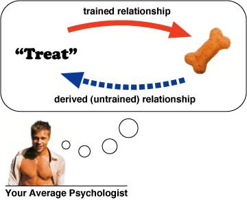然而,人们可以毫不费力地从一条信息中收集到两个或更多的关系。例如,如果你给你的普通心理学家一个狗饼干,并称之为“treat”,他会立即推断,“treat”也是描述狗饼干。他导出了两种关系,其中只有一种是被教导的,另一种是他自己揣摩推衍出来的。