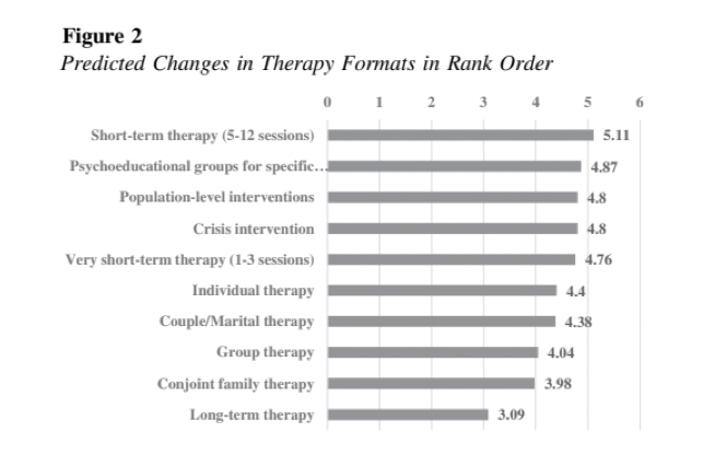 除了技术、个性化和多元文化之外,作者将这些结果解释为在心理健康方面优先考虑以最小的成本获得**的回报。成本效益和其他经济因素是专家小组成员预测的基础。未来强调短期和非常短期的治疗、硕士级别的临床医生、自助资源、疗程数量的减少以及报销费用的管理,这些都是显而易见的财务驱动因素。