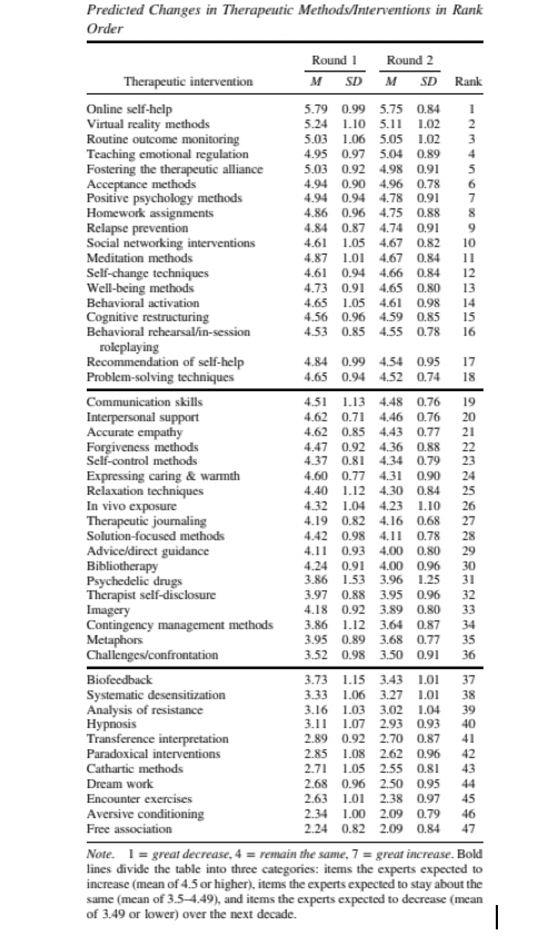 预计将增加的方法/干预措施:最具特色的计算机技术(在线自助、虚拟现实、社交网络)、关系技能(常规结果监测、培养治疗联盟)、以赋能为导向的方法(积极心理学、增进幸福感的方法)、技能建设技术(教情绪调节、家庭作业、预防复发、行为激活、认知重组和问题解决的技术)和客户自我改变(自我改变技术,自助建议)。相比之下,自由联想、厌恶性条件反射、偶遇练习和梦的工作的减少幅度**。