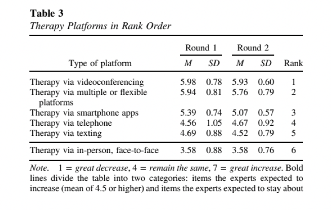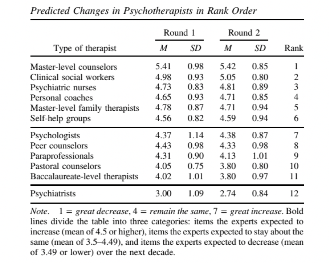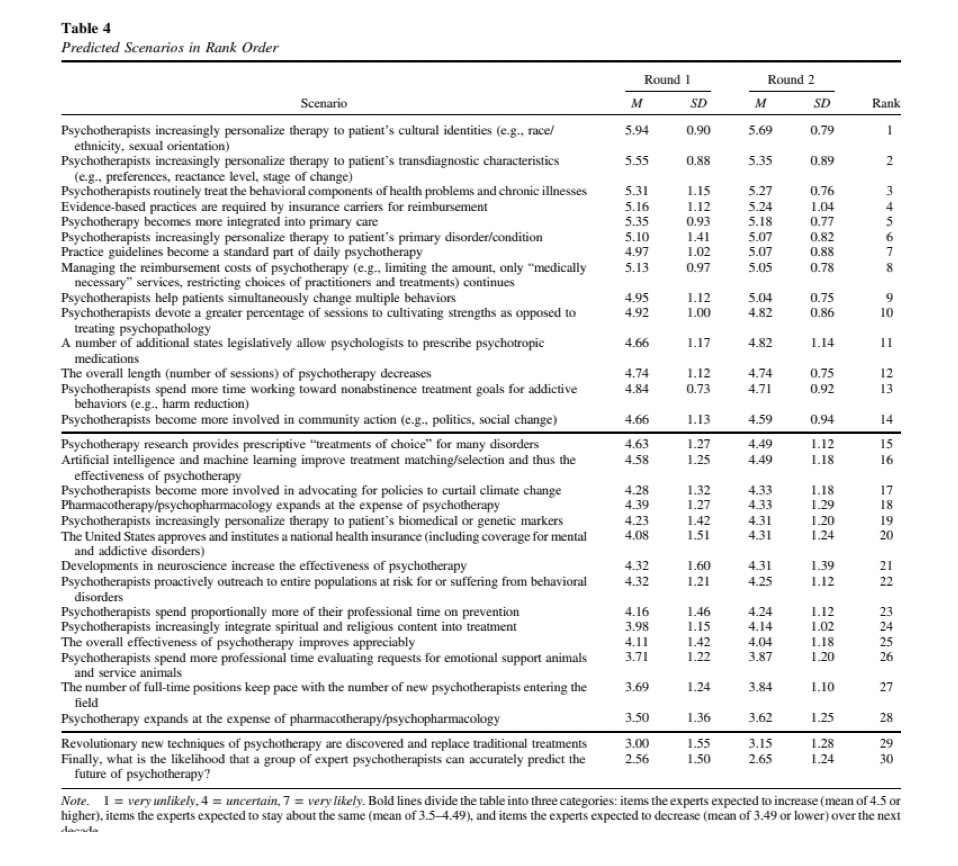 Norcross,J.C., Pfund, R. A.&Cook,D.M. .(2022)The Predicted Future of Psychotherapy: A Decennial e-Delphi Poll.Professional Psychology: Research and Practice.53,109–115. https://doi.org/10.1037/pro0000431