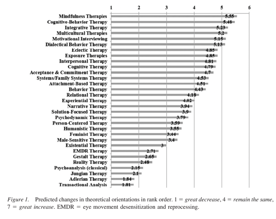 他们预测,未来十年内,预计在9个方向上将增加,15个方向预计保持不变,12个方向预计会减少。预期增长最多的方向是多元文化、正念、认知行为、动机访谈、接纳承诺、同性恋肯定和辩证行为疗法。