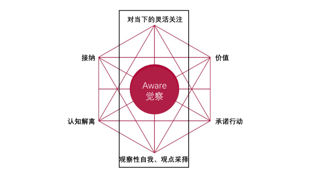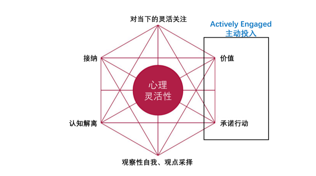 接下来讲心理灵活性的六个组成部分,它们不仅仅是理论上的练习。每个核心点都有衡量的尺度以及众多研究支撑。每个核心点由内核推动。