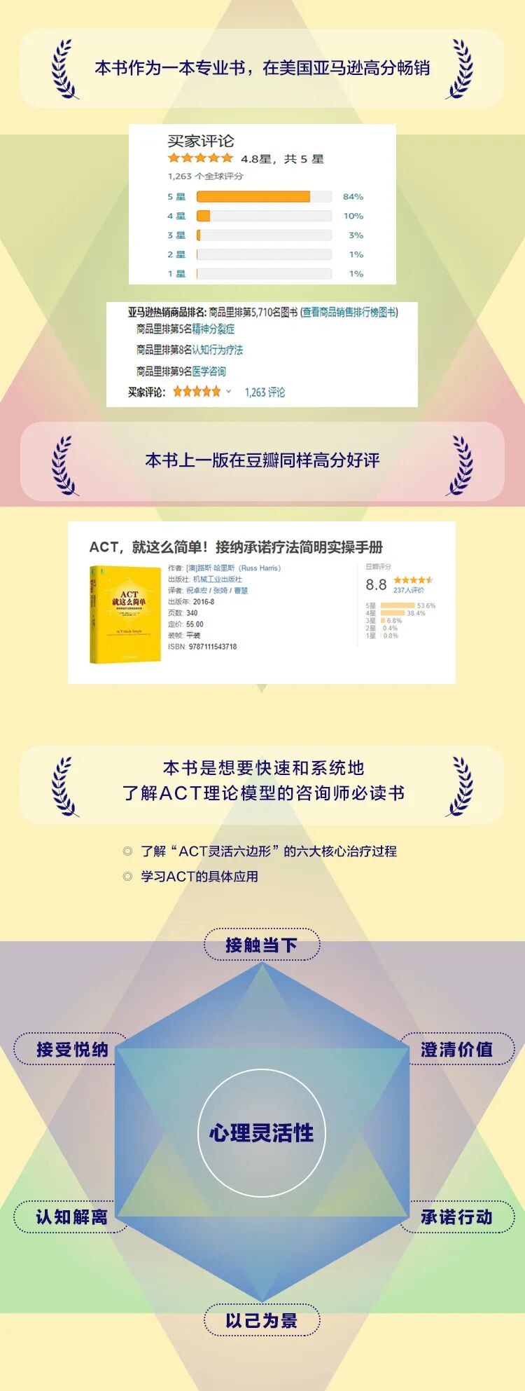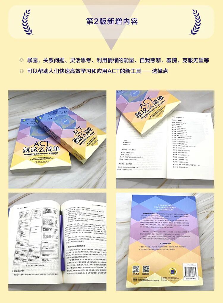 第2版增加了大量的新材料,包括暴露、关系问题、灵活思维、利用情绪的能量、自我慈悲、羞愧、克服无望以及很多其他内容。事实上,本书60%以上是新内容,其他内容在重写时也有显著的创新。从第1版面世至第2版出版的10年间,我践行和教授ACT的方法都有了根本的改变。(真的,我本来要从头开始写一本全新的教材的,书名就叫《ACT可以更简单》(ACT Made Even Simpler),但是出版社劝我打消那个念头。)所以在第2版中,你可以找到许许多多的新练习、隐喻、工具、技术、咨询治疗的逐字稿、冷笑话,等等(以及像“AMS 2”(ACT就这么简单2)这么妙的缩写)。